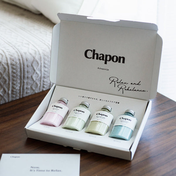 - 商品の特徴: アロマ専門家がブレンドした、Chapon公式ストア限定の入浴剤セットです。さまざまなエッセンシャルオイルを用いた、豊かな香りが特徴です。